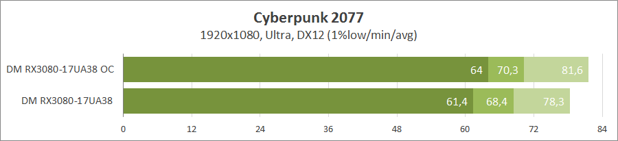 В Cyberpunk вы можете комфортно играть при обычном Ultra-качестве в Full HD. Высокие результаты с трассировкой при активном DLSS.