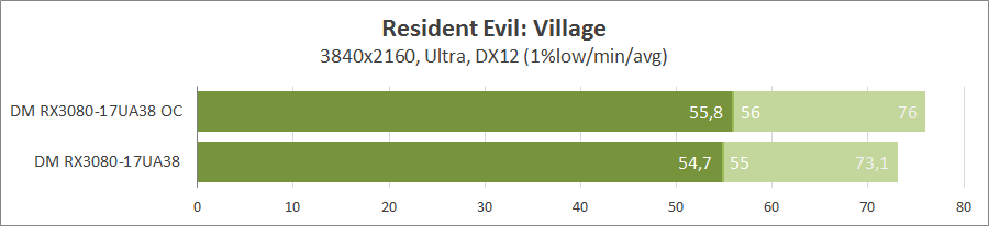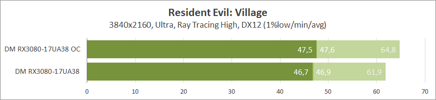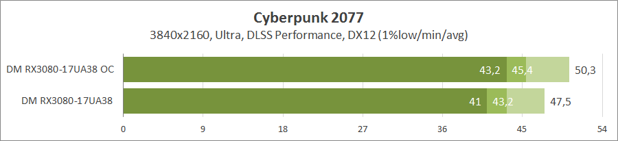 В 4K выходит менее 50 кадров с самым быстрым режимом DLSS, и это без трассировки лучей. Разгон улучшает показатели в тяжелом режиме на 5–6%.