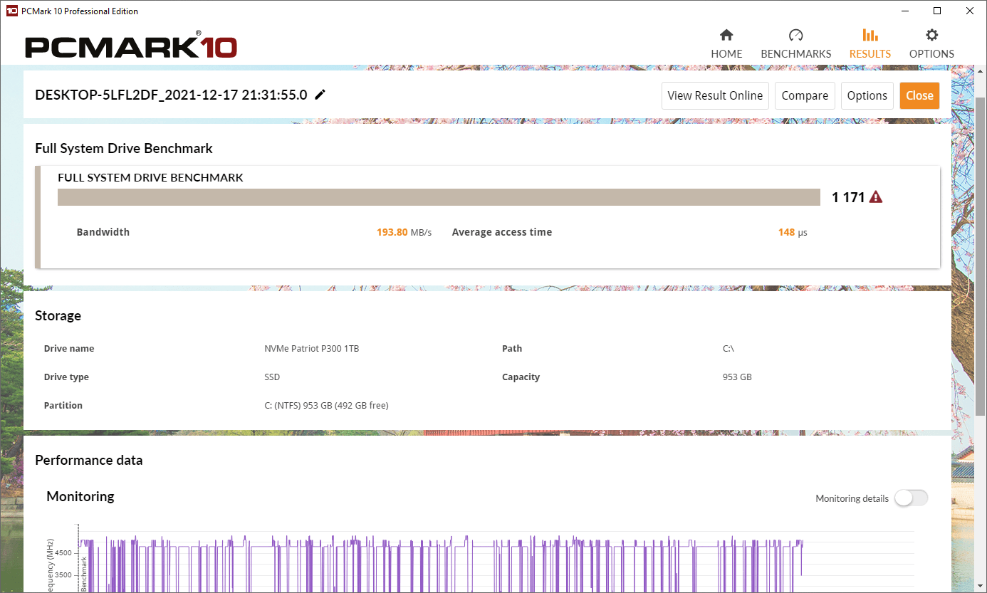 В специализированном тесте PCMark накопитель показал 1171 балл и среднюю пропускная способность 194 МБ/с.