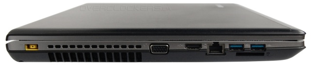 На левую сторону выведены разъемы D-Sub. HDM, RJ-45 LAN Ethernet, два USB 3.0 и слот картридера. Желтый прямоугольной разъем предназначен для подключения источника питания.