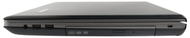 С правой стороны находится комбинированный аудиоразъем под наушники и микрофон, два USB 2.0, оптический привод и замок Кенсингтона.