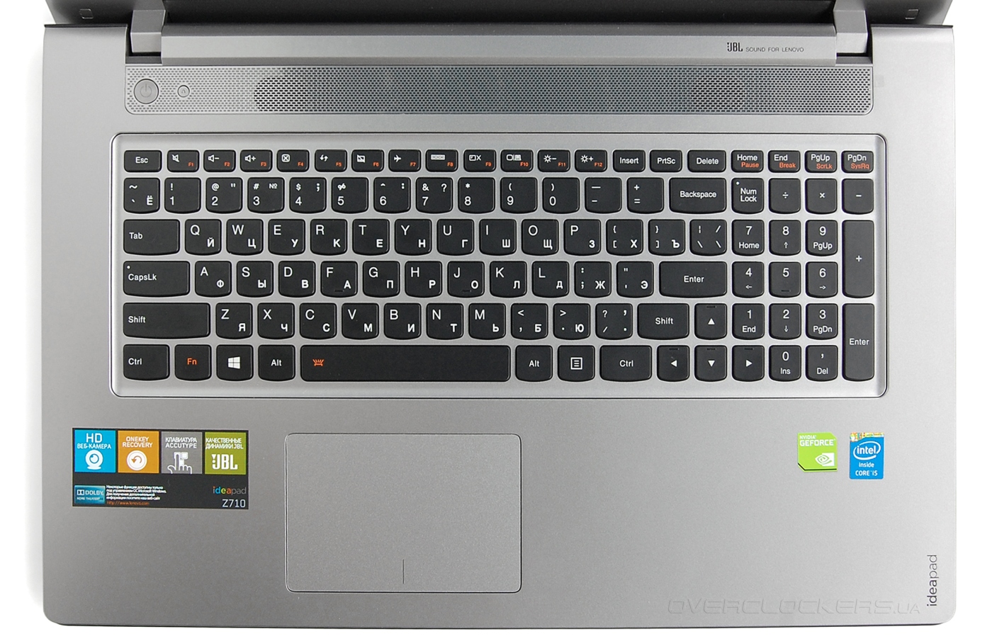 Над клавиатурой тянется мелкая решетчатая вставка, скрывающая стереодинамики JBL. Понятно, что звуковые возможности ноутбуков ограничены из-за их компактных размеров и объема, но в данном случае нужно отметить вполне хорошую громкость и четкость встроенной аудиосистемы.