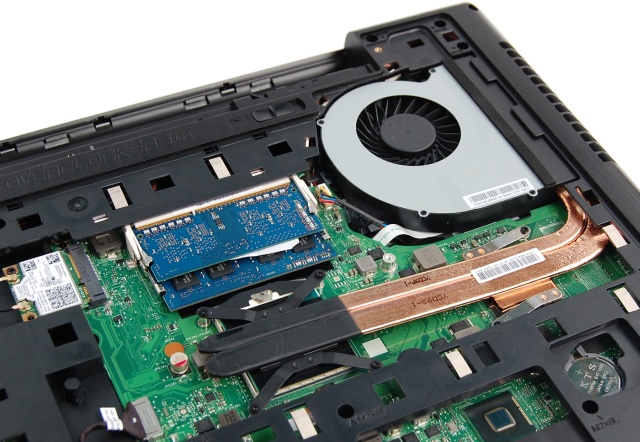 Два слота памяти уже заняты планками DDR3. Система охлаждения единая. Две приплюснутые тепловые трубки контактируют с центральным процессором слева и графическим чипом справа. Последний, как видим, распаян прямо на системной плате. Память у него набрана микросхемами Micron, которые на фотографии не видны. Слева в плату вставлен Wi-Fi модуль Intel Wireless-N 7260.