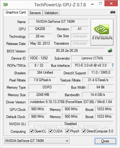 GeForce GT 740M базируется на процессоре GK208. Постоянным читателям нашего сайта этот GPU может быть знаком по обзору видеокарты ASUS GT630-SL-2GD3-L. Эта обновленная версия GeForce GT 630 оказалась лучше старой модели. В данном случае мы имеем аналог на еще более высоких частотах. Процессор GK208 работает на 980 МГц с заявленным Boost Clock 1033 МГц. У настольного брата фиксированная частота в 900 МГц. GeForce GT 740M оперирует двумя гигабайтами отдельной памяти DDR3. К сожалению, из-за узкой шины в 64 бита частота памяти очень критична для итоговой производительности. И вот тут как раз нет никакого прогресса относительно упомянутого аналога из десктопного сегмента — у обоих эффективная частота микросхем памяти 1800 МГц.
