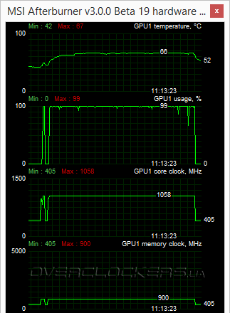 В реальности частота ядра оказывается выше официального Boost Clock. Нижний скриншот нагрузки в Unigine Valley benchmark демонстрирует нам стабильные 1058 МГц.