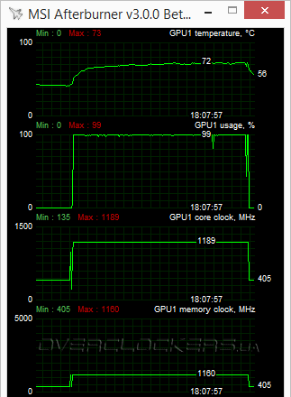 Видеокарта доступна для операций разгона при помощи любых специализированных утилит. В MSI Afterburner нам удалось ее разогнать до 1189/2320 МГц. Особенно впечатляющий прирост 29% по памяти, что позволяет надеяться на столь же впечатляющий прирост производительности. Вдвойне приятно, что температура ядра выросла лишь на несколько градусов, а общий шумовой фон не изменился. Все благодаря сверхнизкому TDP графического процессора.