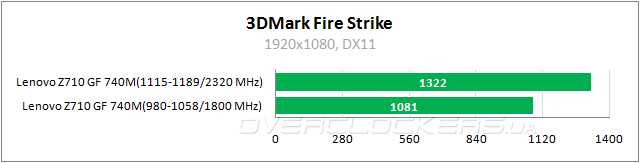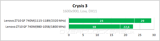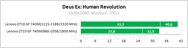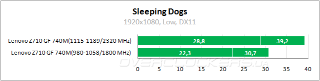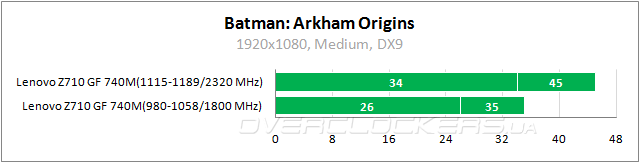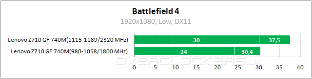 В номинале ноутбук едва выдает 30 fps, но при разгоне обеспечивает приемлемые показатели. Так что и тут можно будет играть в родном разрешении 1920x1080.