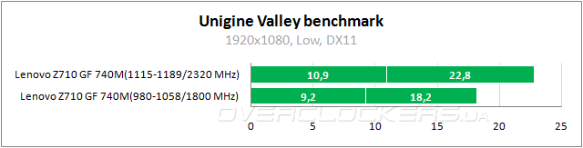 Ну и результаты в Valley benchmark. Тест этот нами применялся для прогрева, потому изначально выбран сверхтяжелый режим, и итоговые результаты едва выходят на уровень 20 fps даже при разгоне.