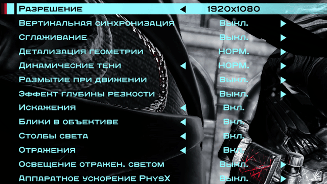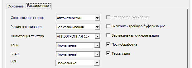 В параметрах графики установлена «нормальная» детализация геометрии и теней. Отключены эффекты размытия в движении, глубины резкости и освещения отраженным светом. По факту отключены все параметры прогрессивного ренденринга под DirectX 11.