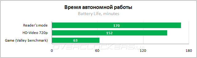 Для оценки возможностей работы ноутбука в автономном режиме произведены испытания при разном типе нагрузки. Первый вариант — режим чтения. Запущено приложение Ice Reader Book, в котором автоматически проматывается текст. Фиксируется время работы до полного выключения устройства. Во втором случае замерялось время работы при проигрывании видео разрешением 720p. Третий режим предполагал постоянную работу Valley benchmark.