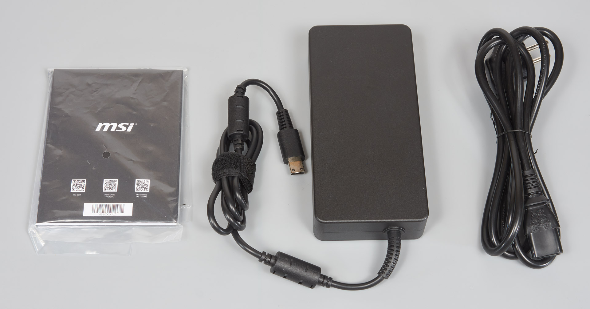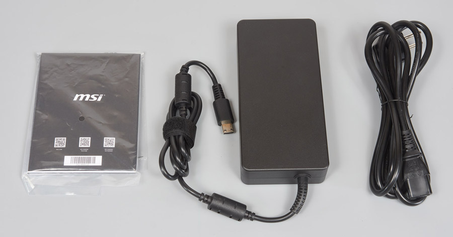 Внутри ноутбук надежно зафиксирован с помощью мягких уголков. В боковом отсеке находятся дополнительные аксессуары. Комплектация стандартная: блок питания, кабель для него и инструкция.