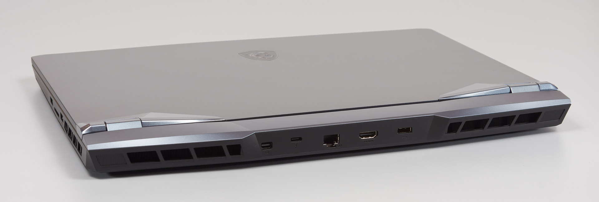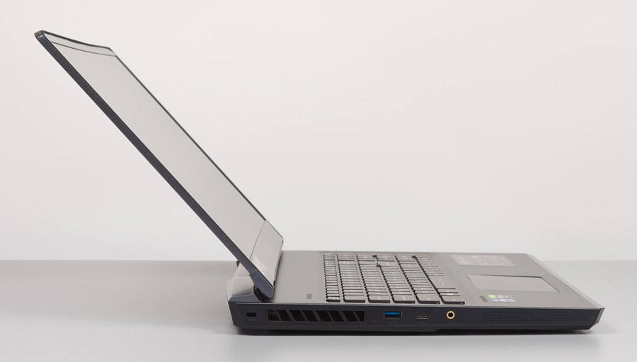 Строгие очертания корпуса сочетаются с выдающимися элементами в районе петель. Также в задней части ноутбука и по бокам присутствуют большие прорези для выдува горячего воздуха. С этой стороны расположены порты mini-DisplayPort, Thunderbolt, HDMI, Ethernet и разъем для кабеля питания.