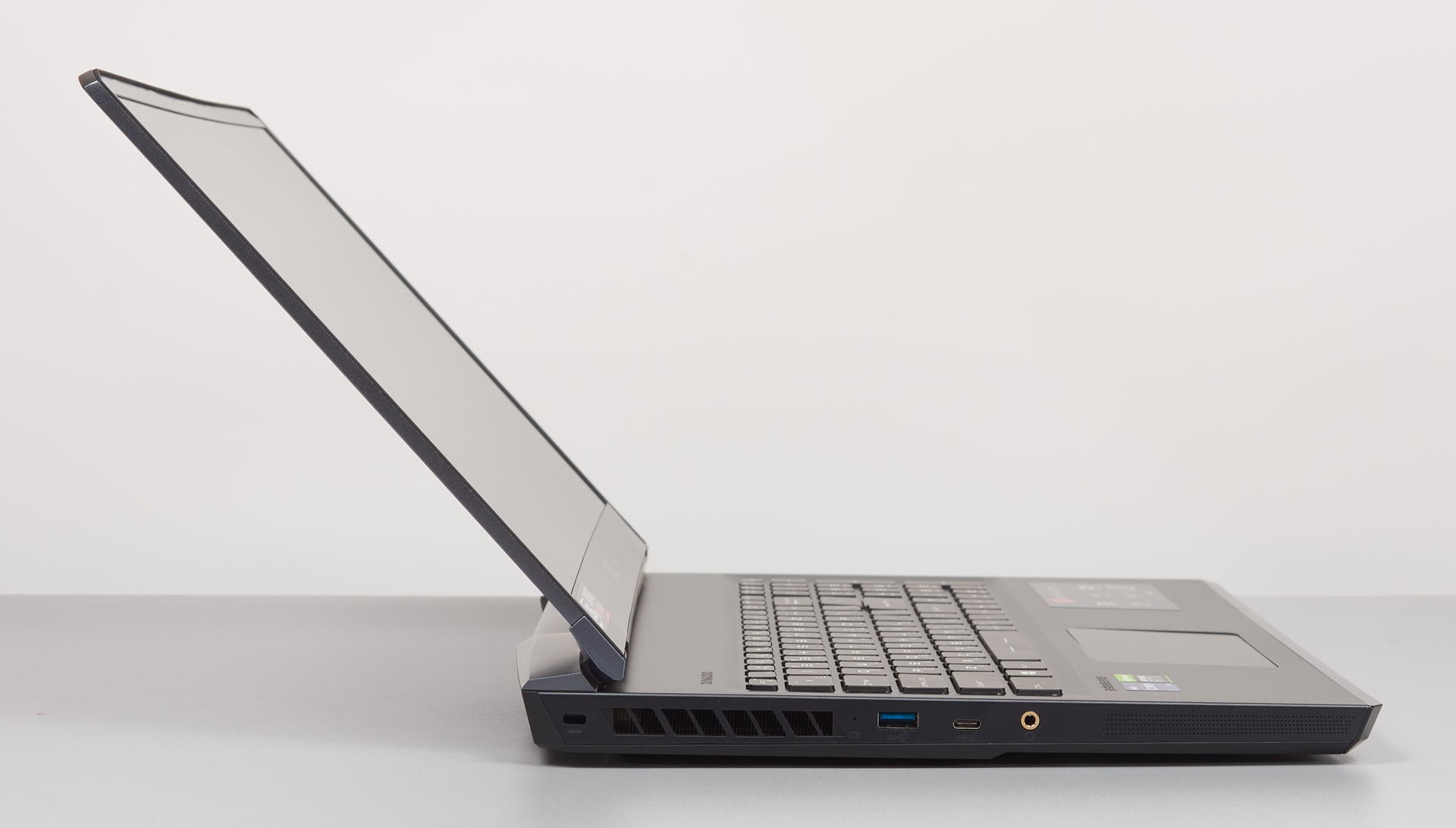 С левой стороны ноутбука присутствуют разъемы Kensington Lock, порты USB 3.2 Gen.2 и USB 3.2 Type-C, аудиоразъем для гарнитуры.