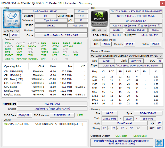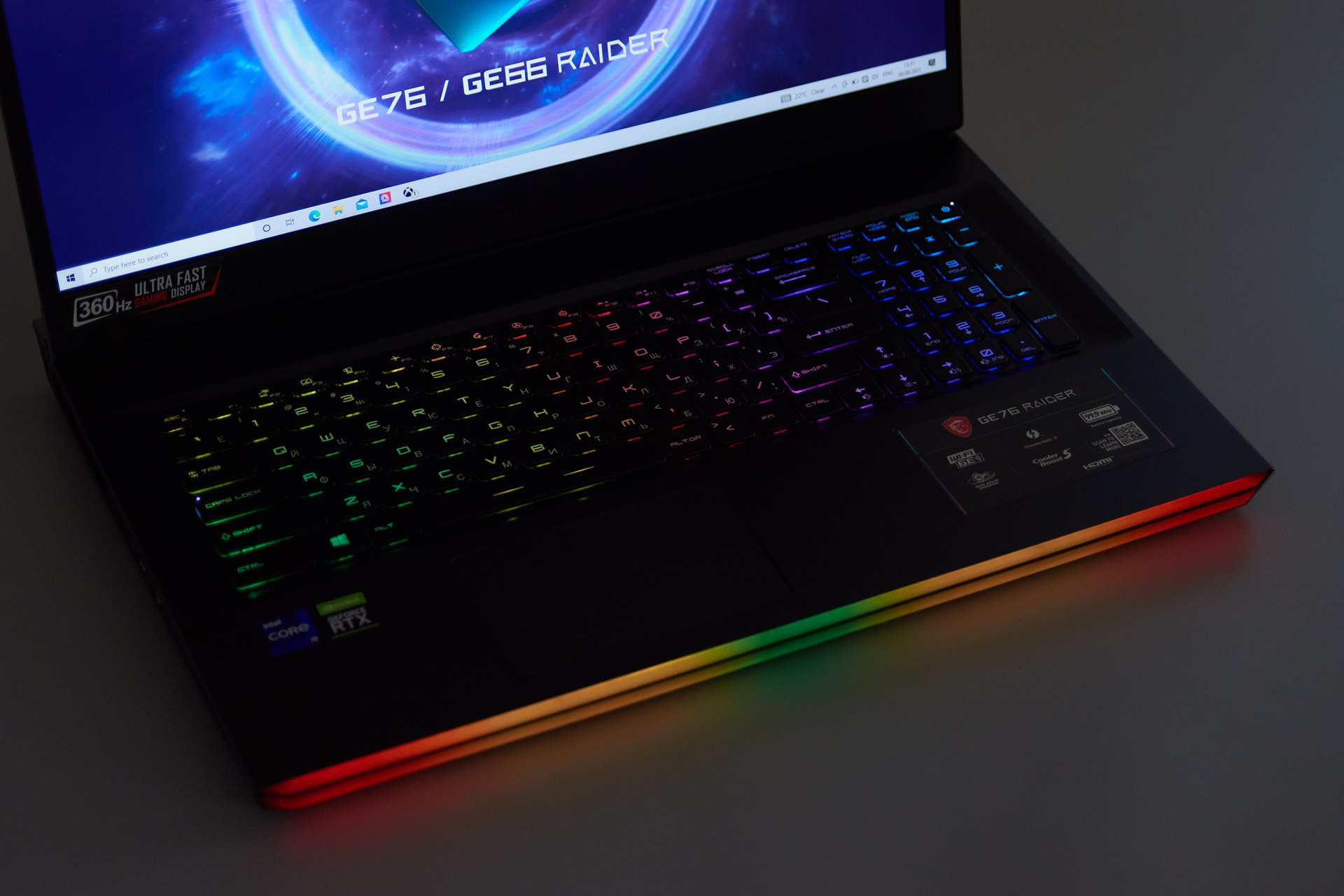 В наши руки попал настоящий игровой «монстр». Он базируется на процессоре Core i7-11980HK (16 потоков при частоте до 5 ГГц), установлено 64 ГБ оперативной памяти DDR4-3200 и быстрый накопитель NVMe M.2 Samsung объемом 2 ТБ. За графику отвечает мобильная версия GeForce RTX 3080 с максимальными для серии частотами и TDP, что уже переводит в ноутбук в категорию выдающихся решений. При всем обилии конфигураций мобильных видеокарт в большинстве лэптопов используются экономичные версии с пониженными частотами. А MSI Raider предлагает максимум производительности от мобильной GeForce RTX 3080.
