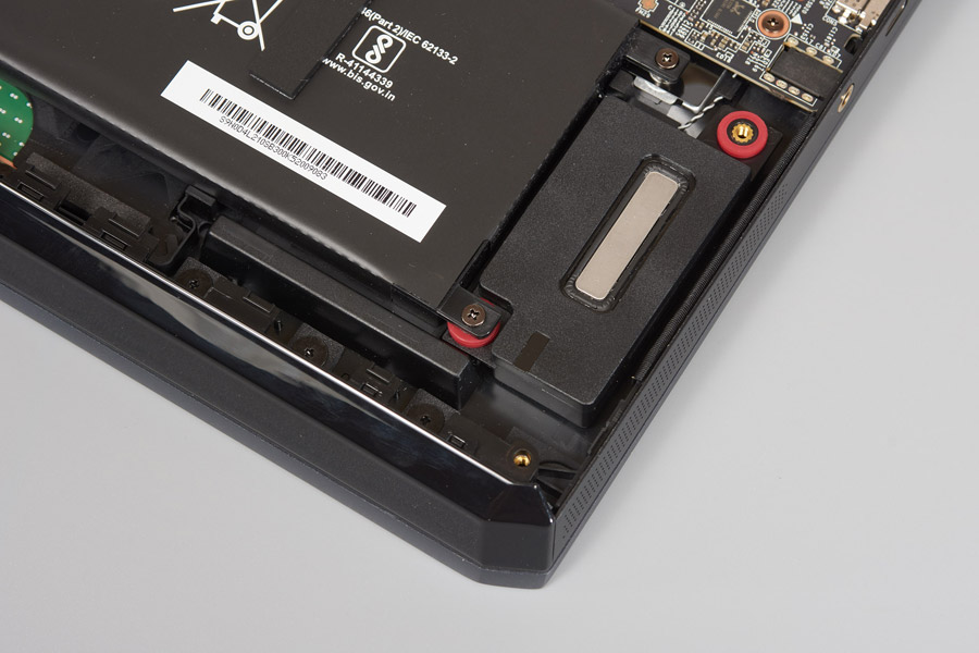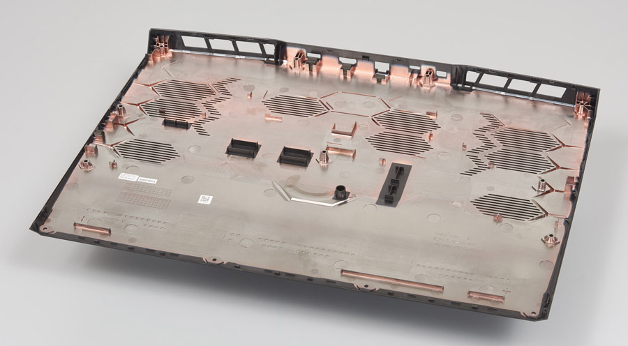 Настало время заглянуть внутрь ноутбука. Нижняя часть корпуса имеет металлизированное покрытие и много опорных точек, чтобы избежать деформации. Но если взять MSI в руки, чувствуется, что пластик немного прогибается в перфорированных зонах.