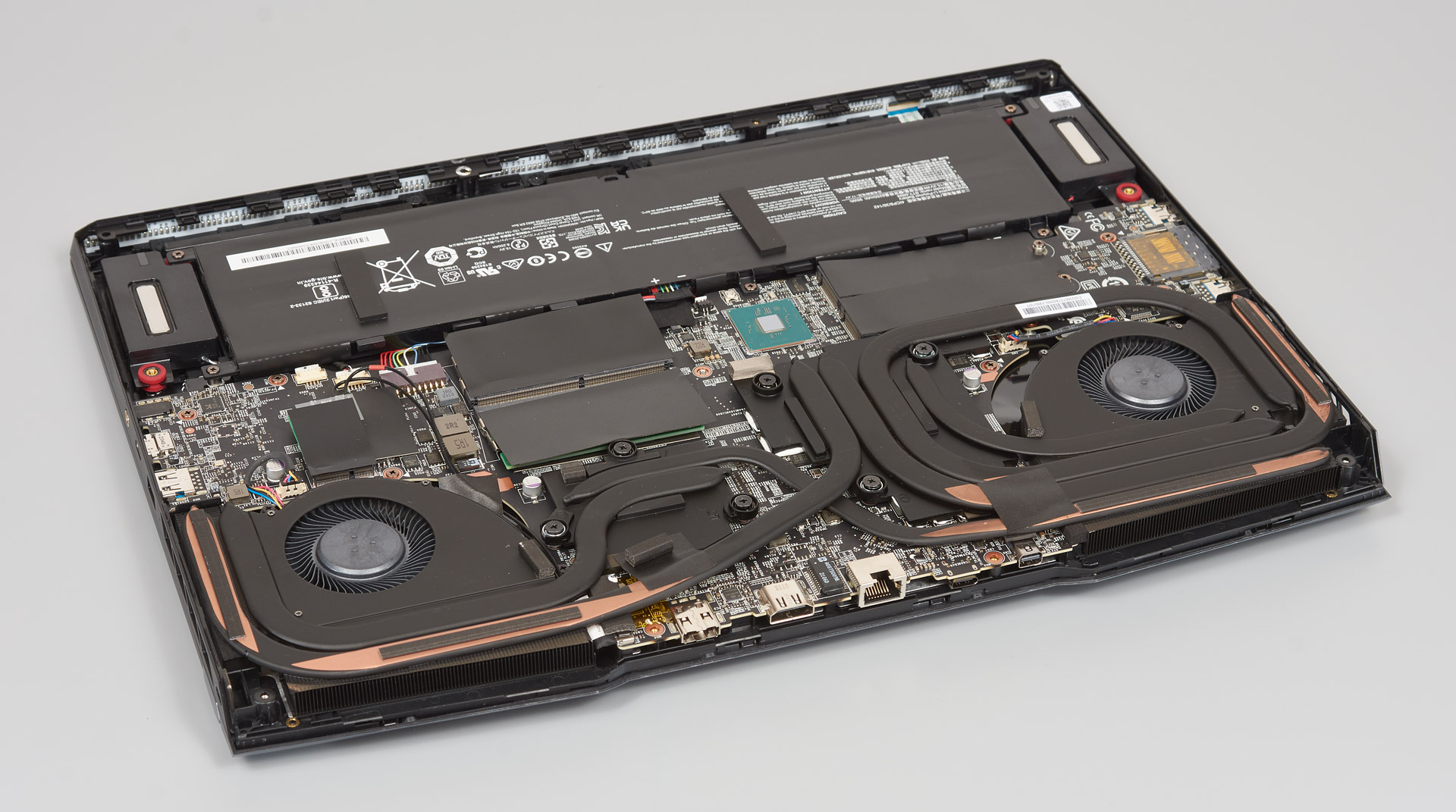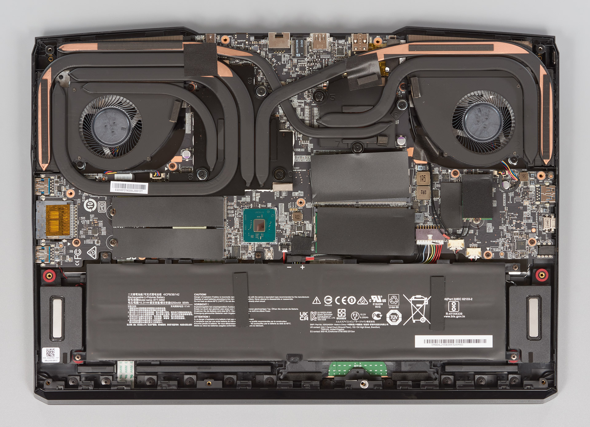 Внутренняя компоновка стандартная. Внизу расположен аккумулятор. Охлаждение представлено двумя турбинными блоками в углах.