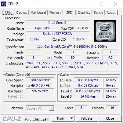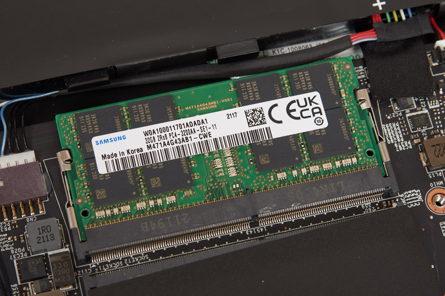 В ноутбуке установлен топовый мобильный процессор Intel Core i9-11980HK на базе 10-нм техпроцесса (семейство Tiger Lake). У процессора восемь ядер, обрабатывающих 16 потоков данных, Smart Cache L3 объемом 24 МБ. Мощность процессора составляет 45 Вт, а частота от 2,6 до 5 ГГц в режиме Turbo Boost. Стоит обратить внимание, что недавно мы рассматривали ноутбук Acer Predator Helios 300 PH315-54 c процессором Core i7-11800H. И основное преимущество топового Core i9 в более высоких рабочих частотах, по ядрам Core i9-11980HK и Core i7-11800H идентичны. Память DDR4-3200 работает в двухканальном режиме с задержками 22-22-22-52-1T.