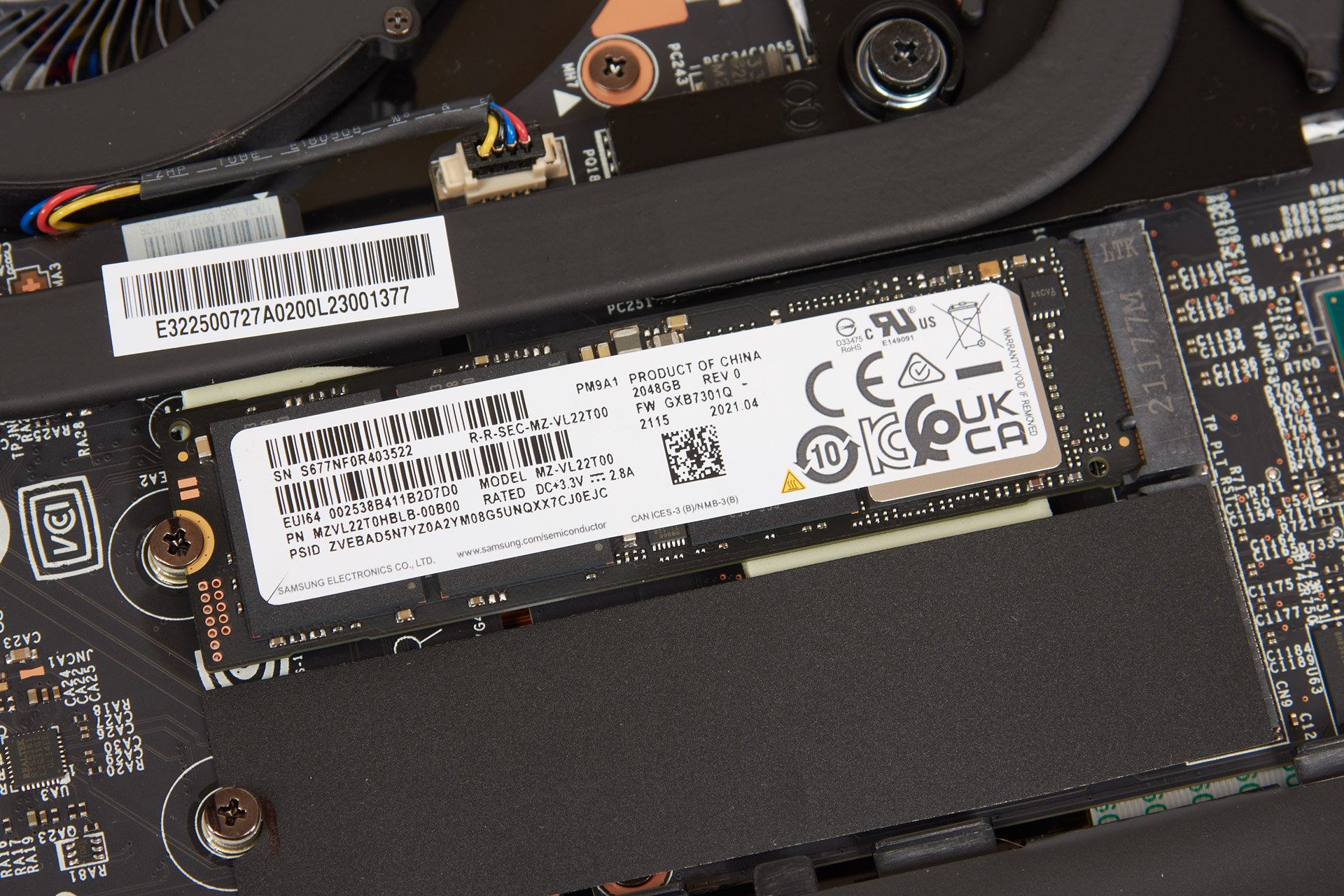 Предусмотрено два места под устройства NVMe M.2. Один разъем занят накопителем Samsung PM9A1 MZ-VL22T00 (MZVL22T0HBLB-00B00) объемом 2 ТБ. Это быстрое устройство на базе многослойной памяти 3D-NAND TLC с подключением по PCI Express 4.0 x4.