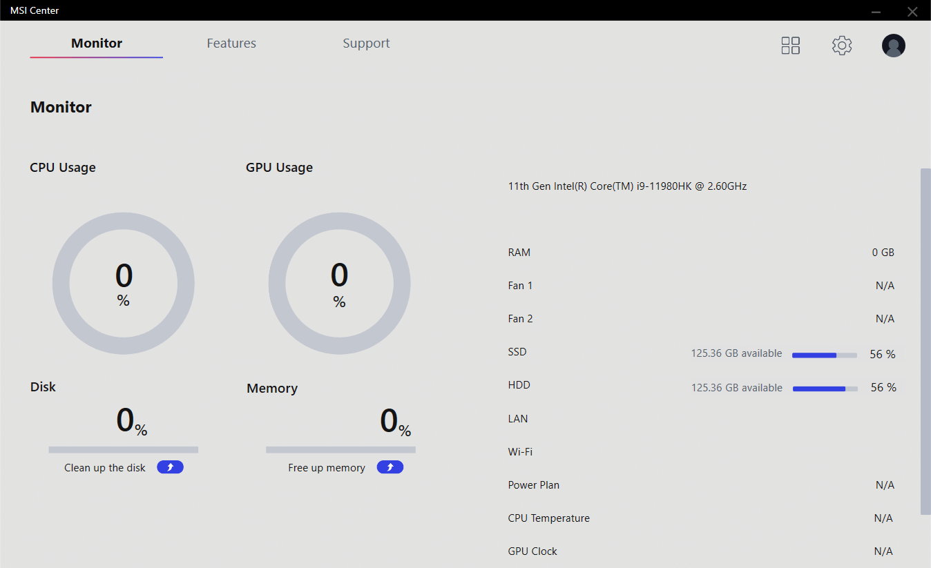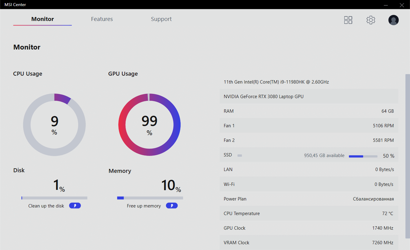 Новое поколение ноутбуков MSI получило обновленное программное обеспечение. Вместо MSI Dragon Center основным системным приложением теперь является более быстрый и отзывчивый MSI Center. Тут отражаются данные аппаратного мониторинга — загрузка, температуры, скорость вентиляторов и прочее.