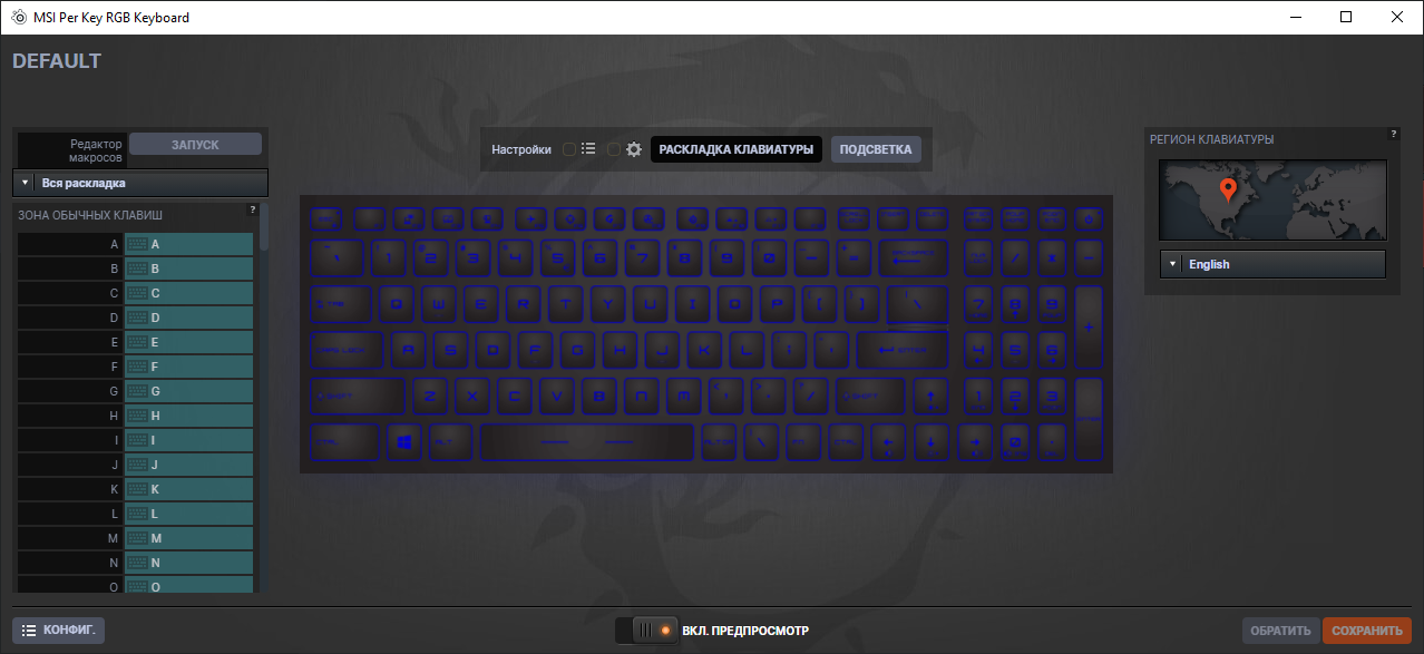 Есть разные световые эффекты и возможность индивидуальной настройки для каждой клавиши. Можно создавать макросы. Предусмотрены профили с разными настройками для отдельных приложений.