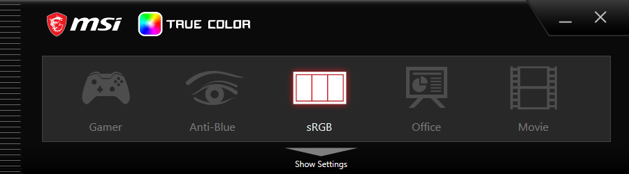 В трее находится приложения MSI True Color с профилями цветности. По умолчанию работает профиль sRGB с заводской калибровкой и оптимальными настройками экрана. Профиль обеспечивает лучшее качество изображения, но яркость ниже максимума — ее можно поднять через стандартные настройки экрана. Другие режимы могут быть полезны для определенного контента (игры, кино) или для снижения нагрузки на зрение.