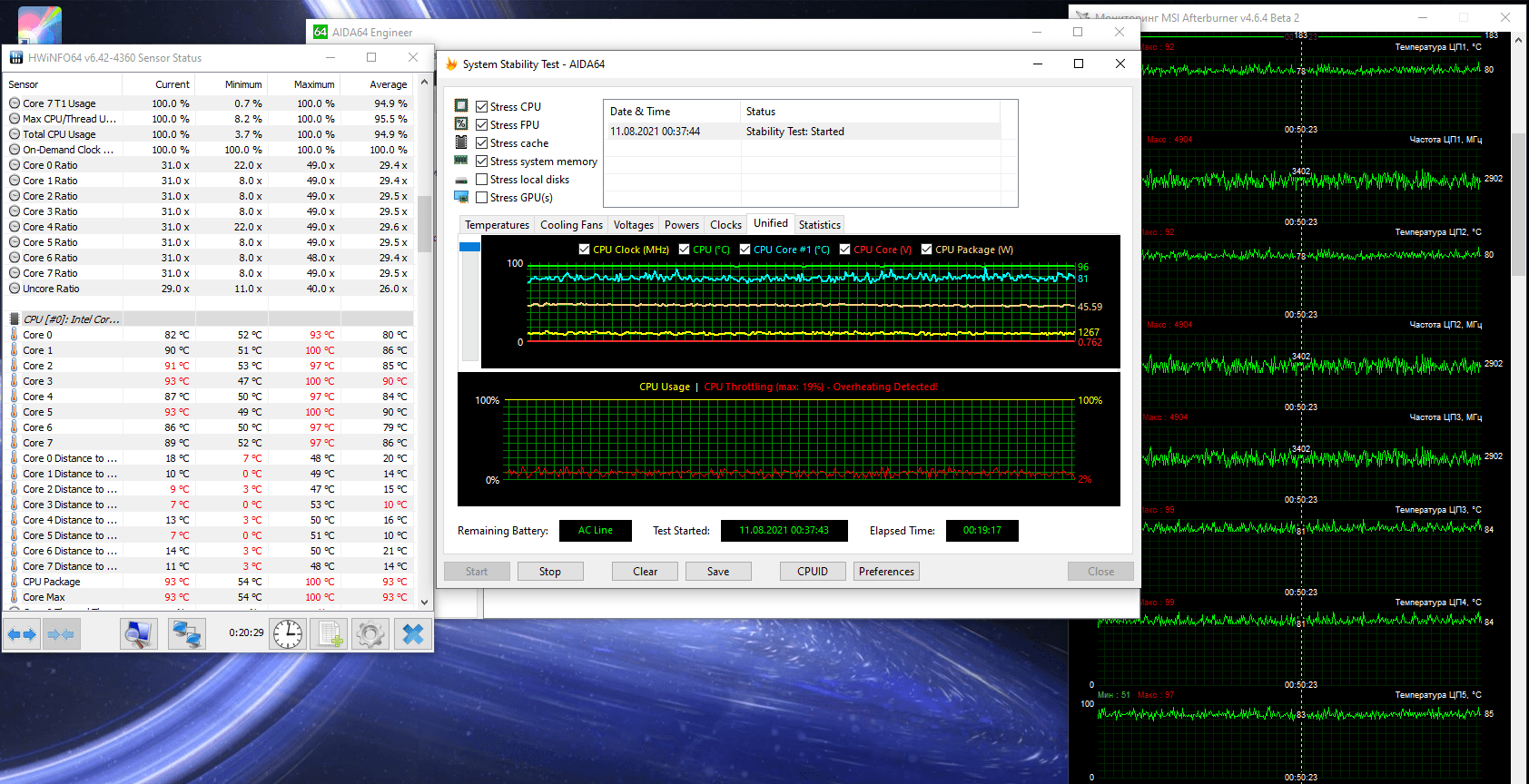 В стресс-тесте частота ядер ближе к 3 ГГц при температуре 80–90 °С, пиковые температуры до 100 °С.