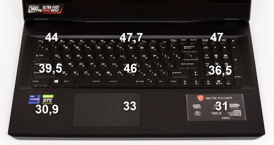 Общие температурно-шумовые показатели на уровне MSI GE66 Raider 10UG. Рабочие температуры высоковаты, но это присуще всем игровым лэптопам.