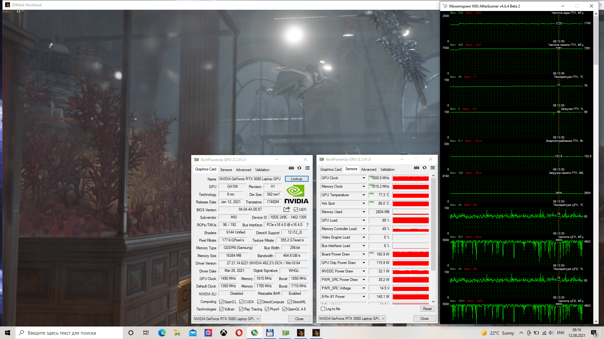 В случае MSI GE76 Raider 11UH-613UA мы имеем максимально производительную мобильную видеокарту. Главным ограничителем являются высокие температуры, которые могут приводить к снижению частот ранее достижения лимита мощности. В качестве эксперимента мы решили оценить, на что способна видеокарта при лучшем охлаждении и с небольшим разгоном.