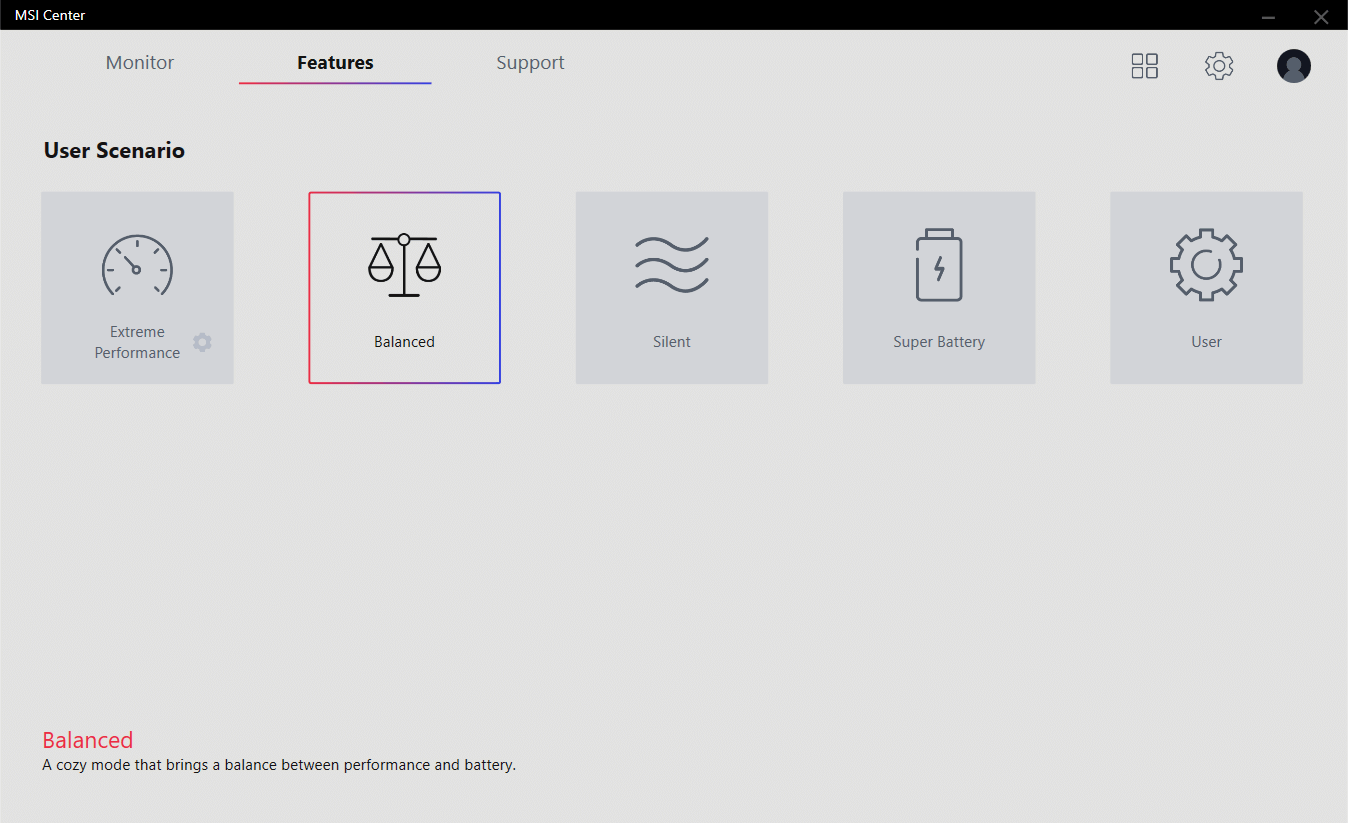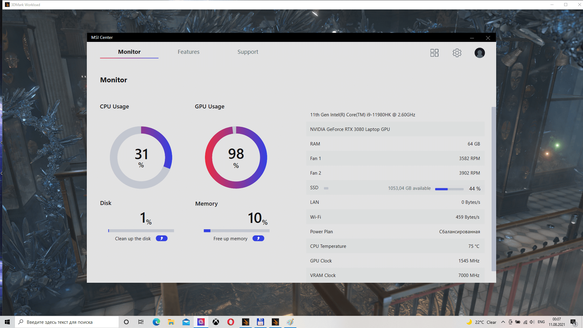 Новое поколение ноутбуков MSI получило обновленное программное обеспечение. Вместо MSI Dragon Center основным системным приложением теперь является более быстрый и отзывчивый MSI Center. Тут отражаются данные аппаратного мониторинга — загрузка, температуры, скорость вентиляторов и прочее.