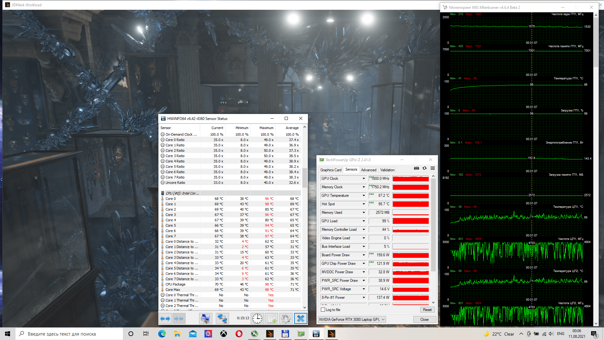 В случае MSI GE76 Raider 11UH-613UA мы имеем максимально производительную мобильную видеокарту. Главным ограничителем являются высокие температуры, которые могут приводить к снижению частот ранее достижения лимита мощности. В качестве эксперимента мы решили оценить, на что способна видеокарта при лучшем охлаждении и с небольшим разгоном.