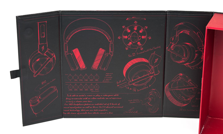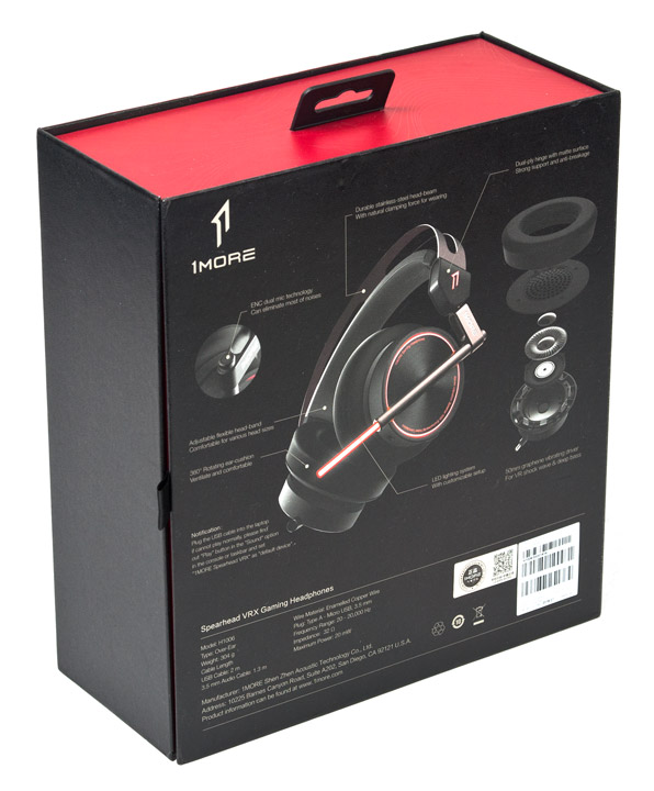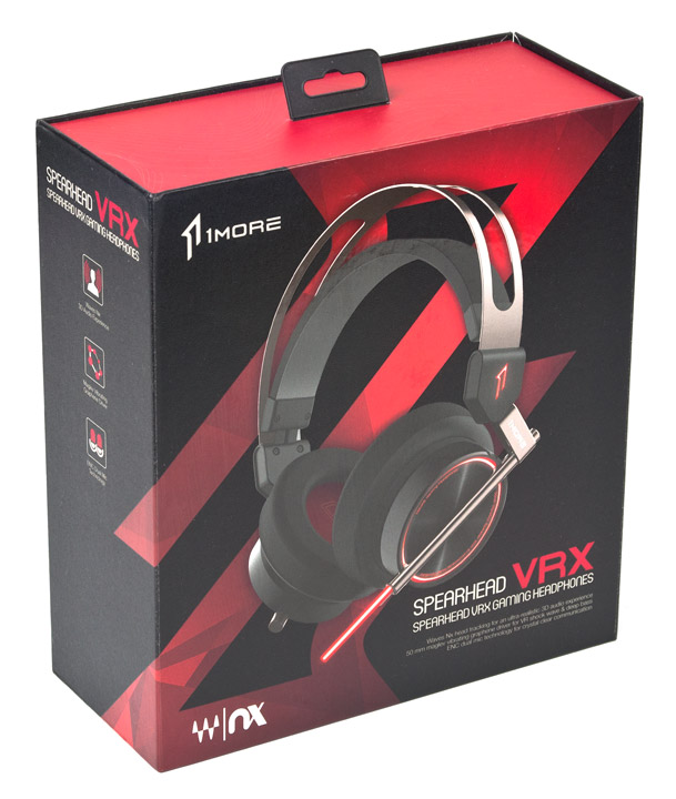1More Spearhead VRX H1006 поставляются в стильной массивной коробке из толстого картона с магнитной застежкой. На передней и задней части бокса поместили фотографию гарнитуры. Помимо этого, сзади описаны главные особенности наушников.