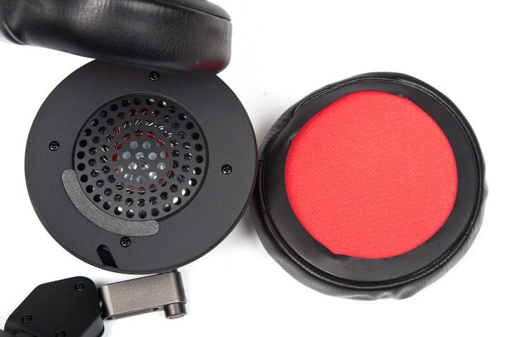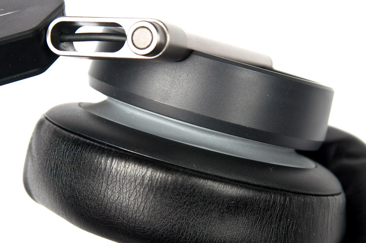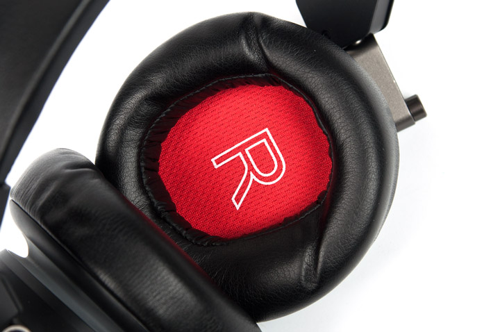 Несмотря на круглые чашки, амбушюры у наушников овальные и сделаны из кожзама. На внутренней части вышиты большие буквы «L» и «R», поэтому перепутать сторону будет сложно. Подвижная часть чашек соединена с основным корпусом посредством прорезиненной вставки.