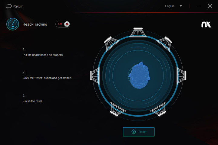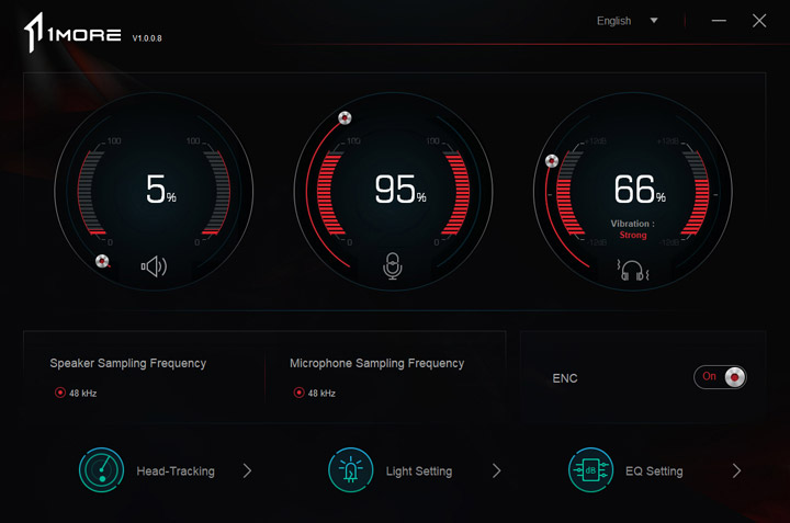 Главное меню программы отображает основные показатели наушников: громкость динамиков, микрофона и уровень вибрации излучателей. Ниже расположились три подменю: Head-Tracking, Light Setting и EQ Setting. Первое нужно для включения упомянутой выше технологии Waves NX. При активной функции наушники отслеживают положение головы пользователя и буквально перемещают большую часть звука на эту сторону. То есть ли вы повернете голову вправо, то звук перейдет в правый динамик, если влево — в левый.
