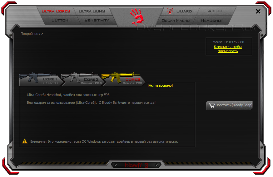 Наиболее интересным и технически развитым является модуль Core 3. Этот режим можно рекомендовать истинным ценителям шутеров от первого лица. Как бы шокирующе это не прозвучало, но для использования указанного модуля вместе с разделами Oscar Macro и Headshot геймерам необходимо дополнительно приобрести специальный код через официальный интернет-магазин Bloody. Код с активацией стоит не много ни мало 20 долларов США. Для понимания необходимости в дальнейшем использовании Core 3 пользователям предоставляется тестовый период, заканчивающийся после 1000 кликов. Сама идея активации части разделов фирменного ПО Bloody3 нам сразу же показалась несуразной, так как ни один из известных производителей геймерского оборудования не осмелился проводить подобную стратегию развития собственного ПО. К примеру, в «облачном» сервисе Razer Synapse 2.0, SteelSeries Engine или ПО CM Storm Recon функции редактирования/создания макросов находятся в свободном доступе.