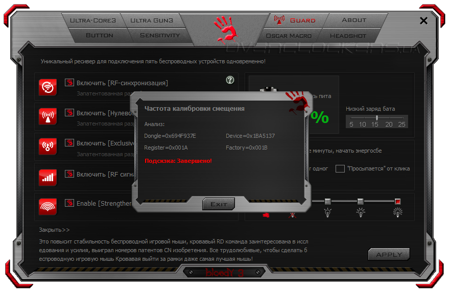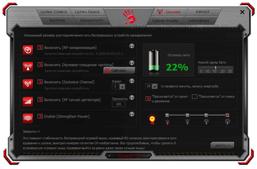 Вкладка Guard даёт возможность настроить яркость подсветки, энергосбережение аккумулятора и переход из спящего режима. В левой части окна находится список параметров работы мыши в беспроводном режиме: «RF-синхронизация», «Нулевое-смещение частоты», Exclusive channel, «RF сигнал детектора» и Strengten Power.
