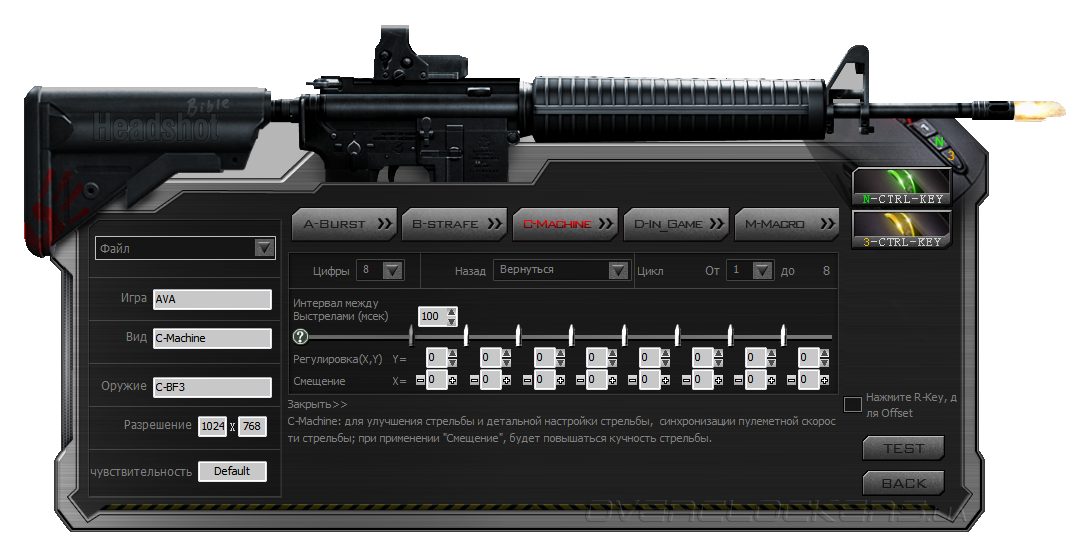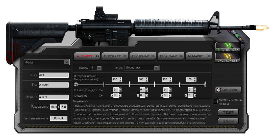 На вкладке A-Bust настраиваются параметры «Смещение» и «Временной интервал» для скорострельного оружия. Всего можно выставить очередь, состоящую из пяти выстрелов. Регулировка скорости стрельбы осуществляется пошагово с учетом временных отрезков. Для повышения кучности стрельбы требуется выставить точное разрешение вашего монитора и отрегулировать смещение по осям X и Y.