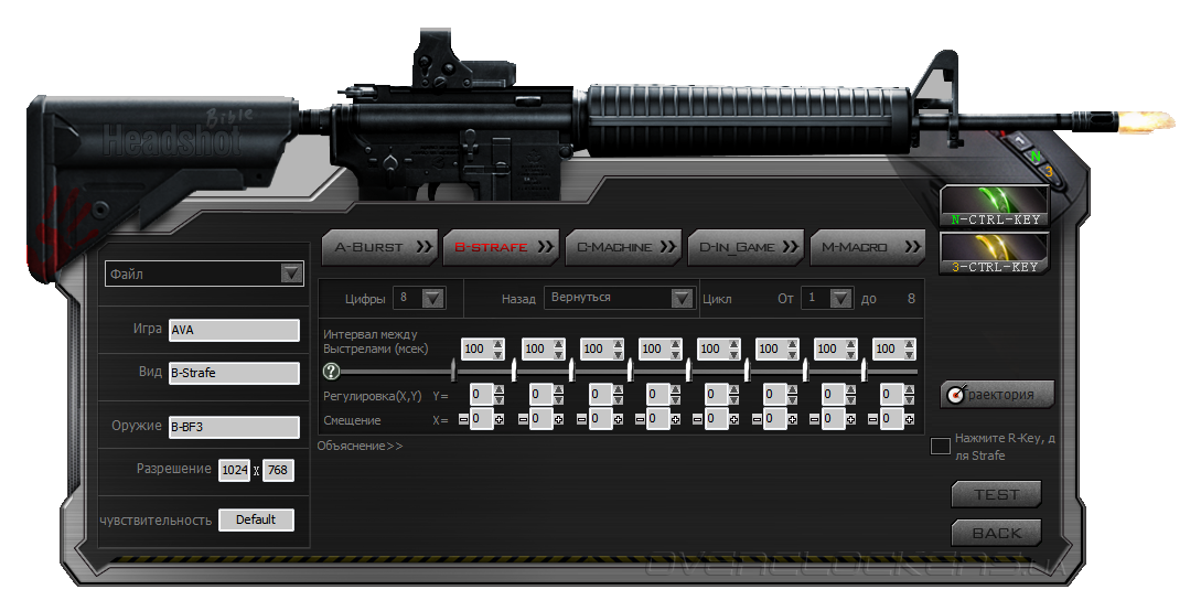 B-Strafe практически полностью повторяет настройки предыдущего раздела за исключением нескольких моментов. Здесь можно задать очередь из восьми выстрелов с циклом повтора.