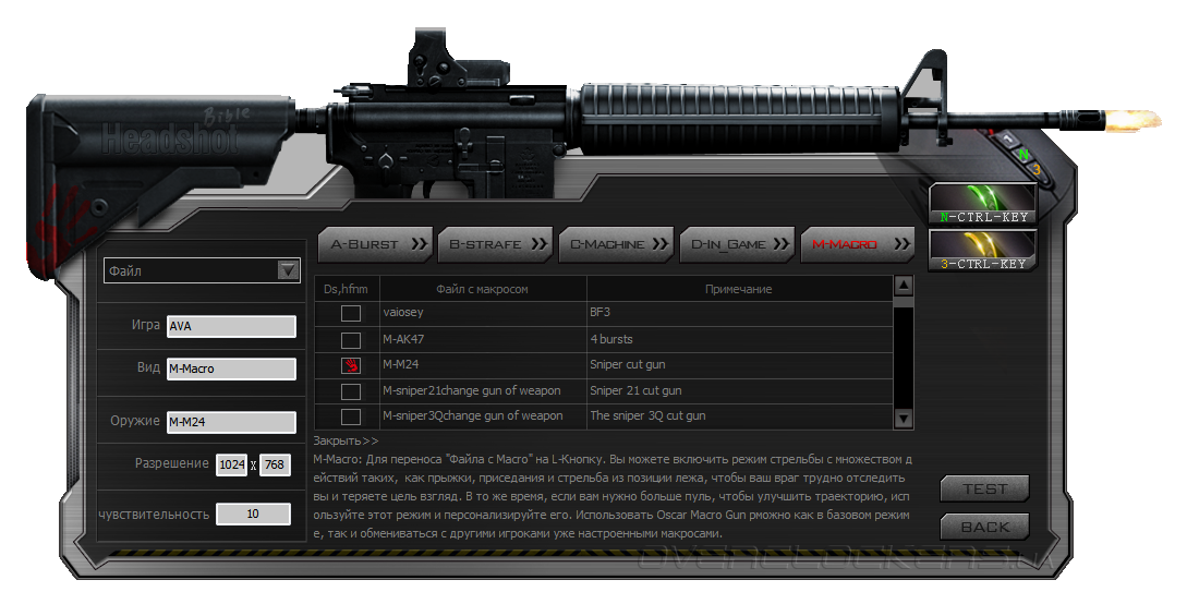 Через M-Macro подвязываются ранее созданные макрокоманды Oscar Macro Gun.