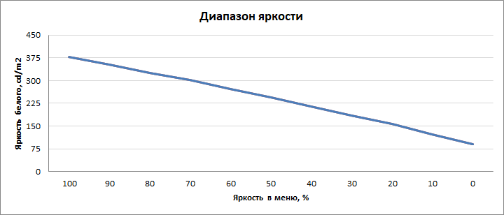 Регулировка интенсивности подсветки доступна в диапазоне от 89 до 377 нит, что незначительно превышает заявленный для матрицы максимальный уровень в 350 нит. Нижний порог яркости тоже оказался слегка завышенным. Для комфортной работы в темное время суток и без источников дополнительного освещения хотелось бы иметь возможность снизить интенсивность подсветки до в 50–60 нит.