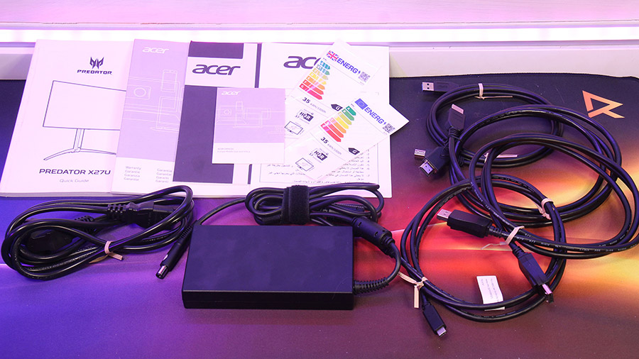 Помимо монитора, разобранного на дисплей и две части ножки, в состав комплектации входит абсолютно все, что нужно для подключения Predator X27U в любой конфигурации: