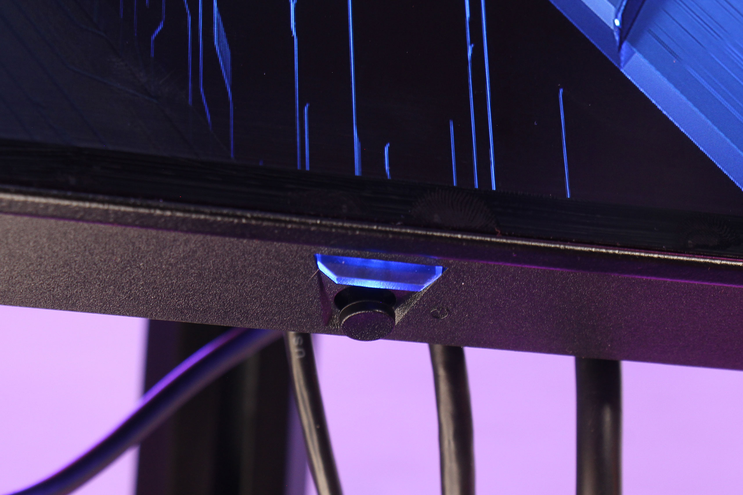 Управление происходит единственным пятипозиционным джойстиком, скрытым на нижней панели по центру. Рядом есть светодиодный индикатор состояния, ненавязчиво светящий на поверхность стола синим цветом в работе, оранжевым в режиме ожидания, и двумя цветами попеременно в сервисном режиме возобновления изображения.