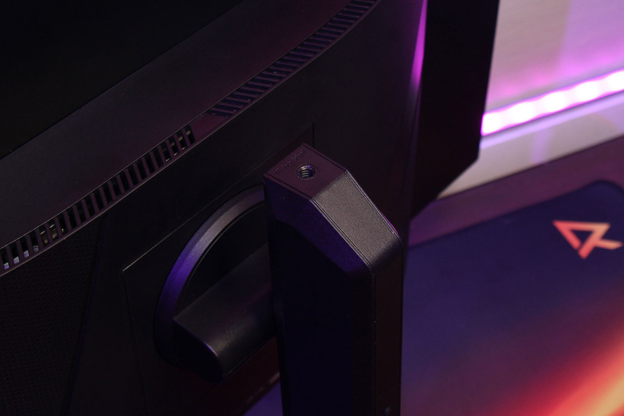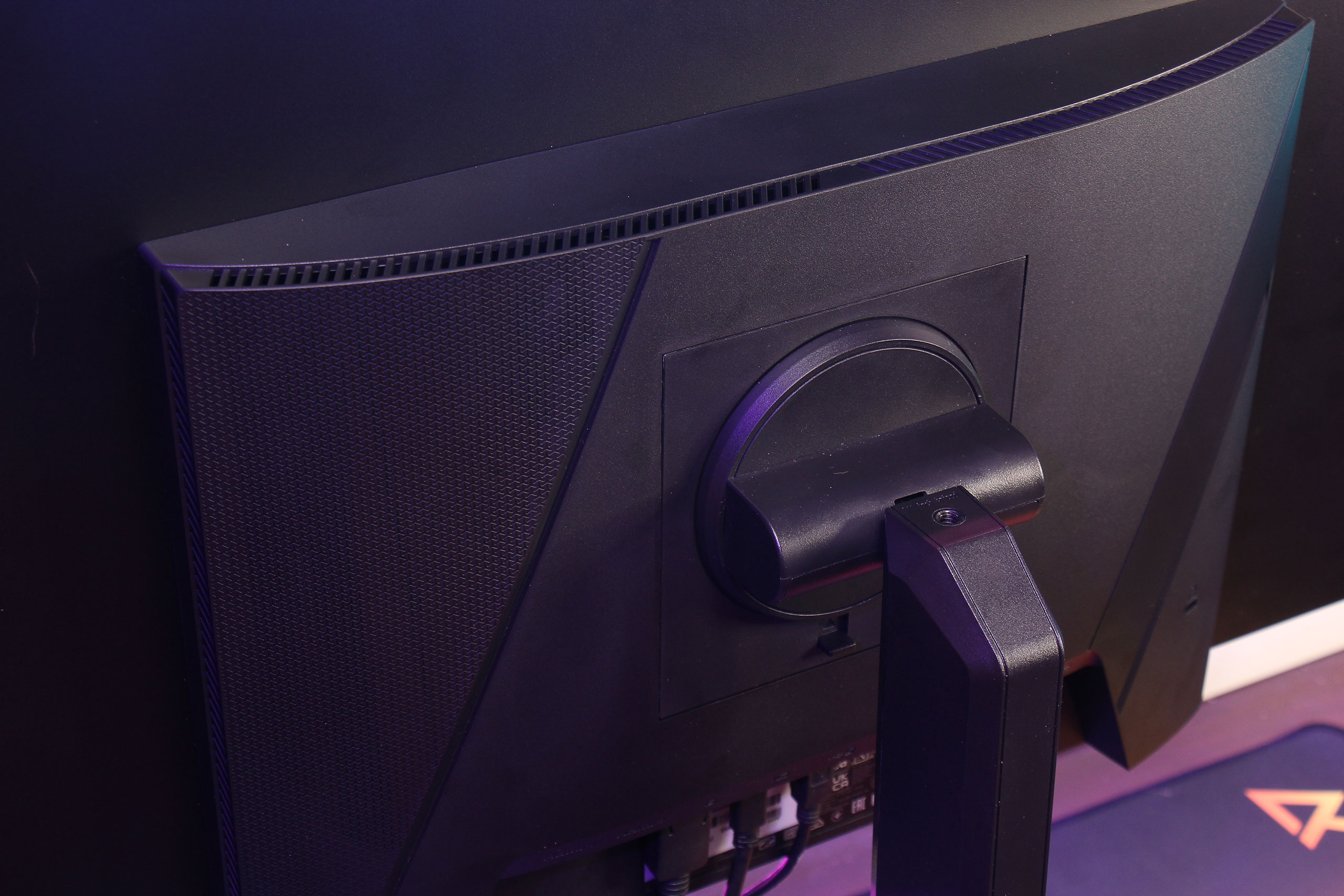 Конечно, по центру монитор толще, но тоже очень аккуратен. Элементы дизайна с обратной стороны помогут тем, кто их вообще видит (ибо монитор не стоит у стены). Там три текстуры пластика — фирменный принт, что-то вроде «шлифованной поверхности» и обычная текстурированная. ARGB-подсветка отсутствует, несмотря на принадлежность к геймерской серии и уважительный ценник. Кому-то такой вид будет казаться недостаточно агрессивным, кто-то наоборот порадуется возможности приобрести игровой монитор без агрессивной эстетики.