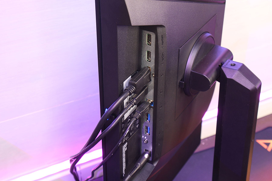 Все порты собраны в единой панели и ориентированы вниз. В общем удобно, хотя чем больше кабелей будет подключено к монитору с разных сторон этой довольно длинной интерфейсной панели, тем сложнее будет обеспечить аккуратный кабель-менеджмент даже при наличии специальной петли на подставке, так как они будут видны отдельно между нижней кромкой дисплея и поверхностью стола. Там присутствуют два HDMI 2.0, Display Port 1.4, USB-C, USB-B, два USB-A (5V/1A), аудио-выход 3,5 мм и разъем питания. Также имеется замок Kensington, что может быть актуально для установки в публичном месте. Из этого списка для подключения компьютера наиболее интересен Display Port 1.4, поскольку он обеспечивает полноценную частоту обновления 240 Гц, в отличие от HDMI 2.0 (к сожалению, поддержки HDMI 2.1 нет). USB-C имеет дополнительную пользу в виде мощной зарядки с поддержкой режимов 5V/3A, 9V/3A, 12V/3A, 15V/3A, 20V/4,5A (работает, если подключен блок питания самого монитора).
