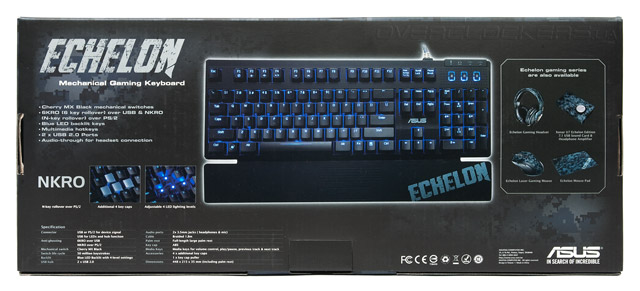 Крупное изображение клавиатуры под другим ракурсом размешено на обратной стороне коробки. Вокруг приводится краткое описание и список технической спецификации. В отдельном окне указаны остальные представители серии Echelon.