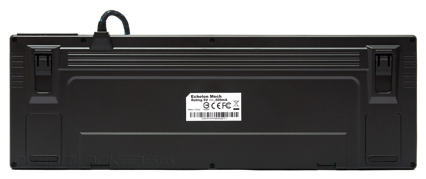Без установленной подладонной подставки устройство практически неотличимо от протестированных ранее Cooler Master Storm QuickFire Ultimate и SteelSeries 7G. Вместе с тем, у Echelon Mech есть свой шарм. Строгий стиль оформления подкреплён насыщенным чёрным окрасом корпуса. Грани корпуса имеют необычную ступенчатые переходы. Внешние границы основного блока клавиш прикрывают невысокие бортики, практически незаметные при взгляде снизу вверх.
