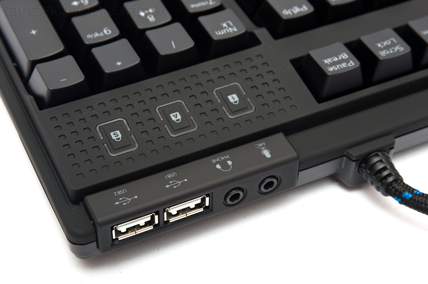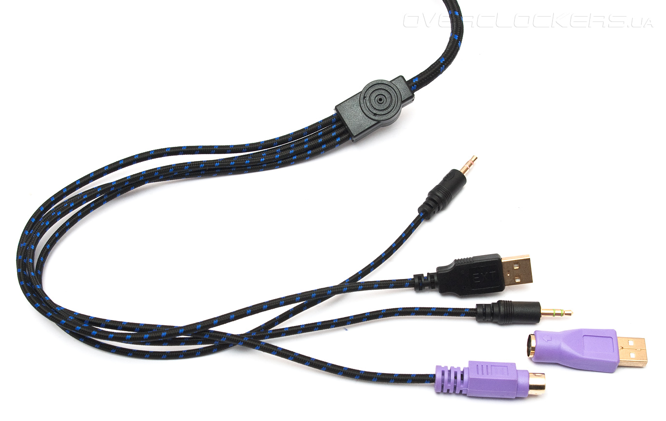 В непосредственной близости от USB-хаба находится место крепления основного кабеля. Его общая длина составляет 1,8 м. Провод отличается большой толщиной и повышенной жёсткостью. Прочная матерчатая оплётка предохраняет внутренности от внешних повреждений и тем самым увеличивает срок жизни самой клавиатуры. Конец основного кабеля разветвлён на пару 3,5-мм штекеров, подключаемых к аудиовыходам звуковой карты, один коннектор USB 2.0, подающий питание на подсветку и встроенный хаб, а также штекер PS2.