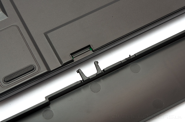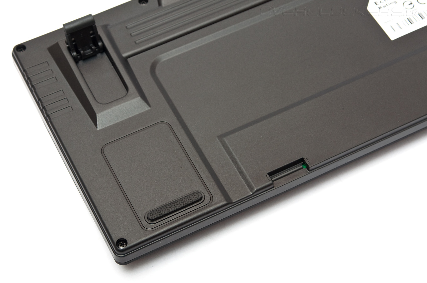 А теперь перевернём клавиатуру и внимательно рассмотрим днище. Оно имеет рельефную поверхность с множеством продольных углублений. По центру наклеена этикетка с указанием модели, серийного номера и прочей технической информации.