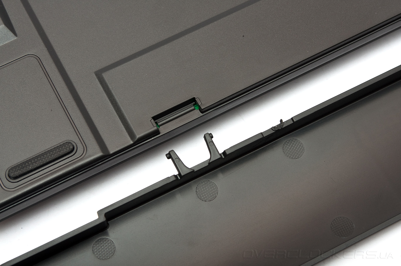 Подладонную подставку с основанием рамы соединяют два фиксатора, размещённые с обратной стороны. Сборка занимает считанные минуты. В процессе монтажа следует быть предельно аккуратными, чтобы ненароком не сломать тонкие пластмассовые фиксаторы.