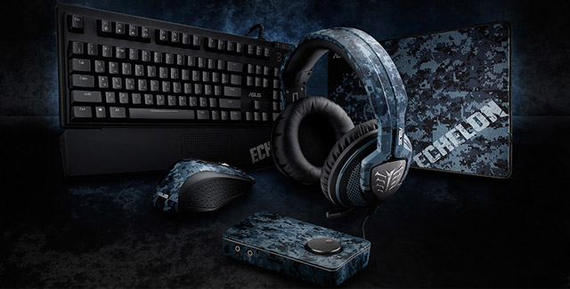Комплект Echelon включает в себя ряд устройств необходимых для получения максимального комфорта и результативности в игровых баталиях. Широкой публике была представлена механическая клавиатура Echelon Mech, лазерная мышь Echelon Laser Gaming Mouse, полноразмерная аудио гарнитура Echelon Camo Edition, звуковая USB-карта Xonar U7 с встроенным усилителем для наушников и поддержкой объемного звучания, игровая поверхность Echelon Mouse Pad.