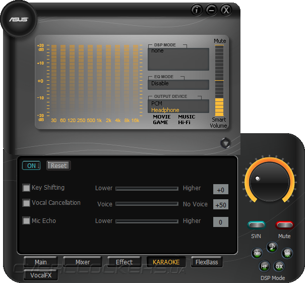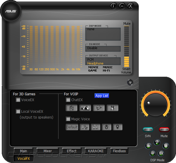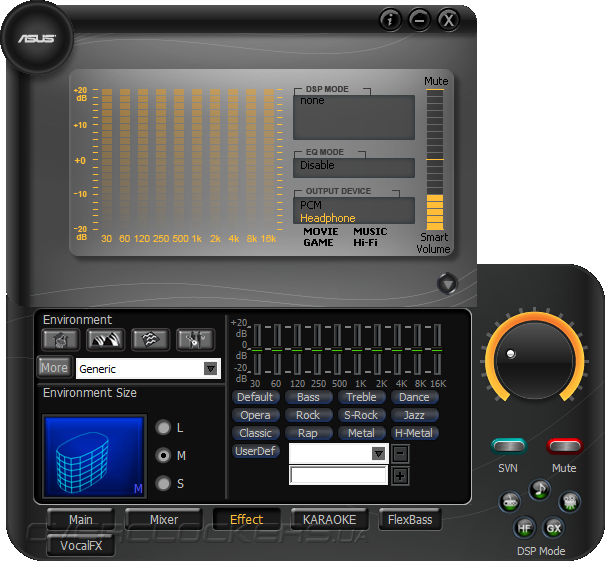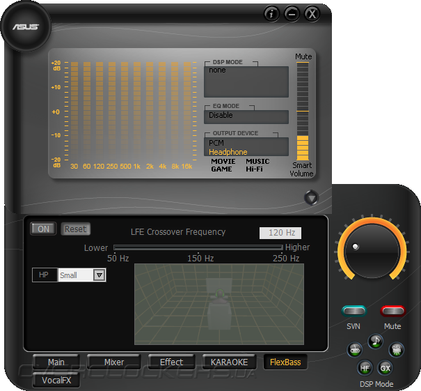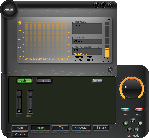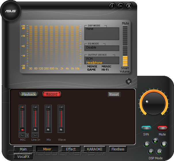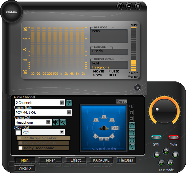Для управления функциями звуковой платы Essence STX II 7.1 служит программное обеспечение Audio Center, которое хорошо знакомое владельцам аудиокарт ASUS на базе чипа AV100 (C-Media Oxygen HD CMI8787). После инсталляции ПО в области уведомления появляется значок, кликнув на который вызывается панель управления, где находится 10-полосный анализатор спектра, регулируется громкость, включается функция SVM (Smart Volume Mode), приглушается звук (кнопка Mute), а также выбирается один из предустановленных программных режимов обработки.